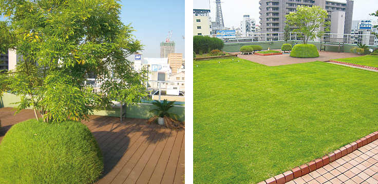 屋上緑化(芝生)・壁面緑化(パネル式・プランター式)